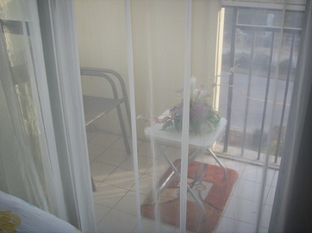 透過紗簾看小小的陽臺