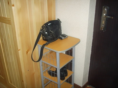 推門進去,就是一個小鞋架子,干凈整潔,進門的小地兒。房間雖小,還是要把它整得整齊點,為了門口換鞋和放雜物的需要,把大衣柜搬到這兒和這個假子一起組成一個小小玄關(guān)。