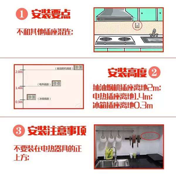 廚房應根據建筑裝修的布置,在不同的位置、高度設置多處電源插座以滿足抽油煙機、消毒柜、微波爐、電飯煲、電熱水器、電冰箱等多種電炊具設備的需要。