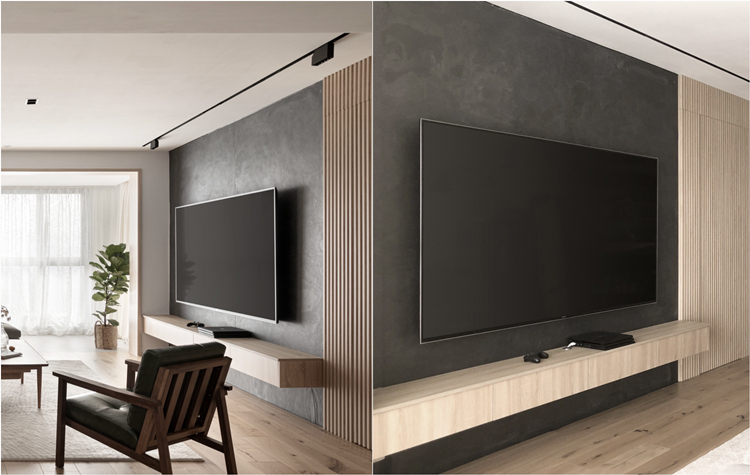 深灰色石材薄板做為電視背景墻,簡(jiǎn)約大氣,搭配原木色格柵板,溫潤(rùn)木質(zhì)與高級(jí)灰的搭配,讓人感到溫馨和放松。