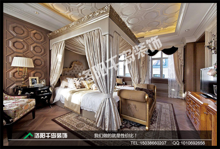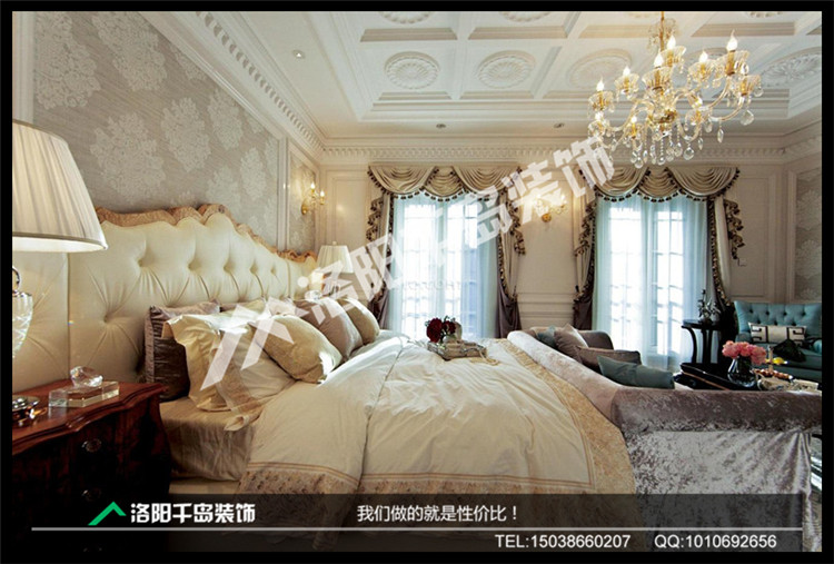 歐式三居室臥室呈現完美的曲線,墻壁和屋頂的雕花設計遙相呼應,歐式大床更添富貴奢華。