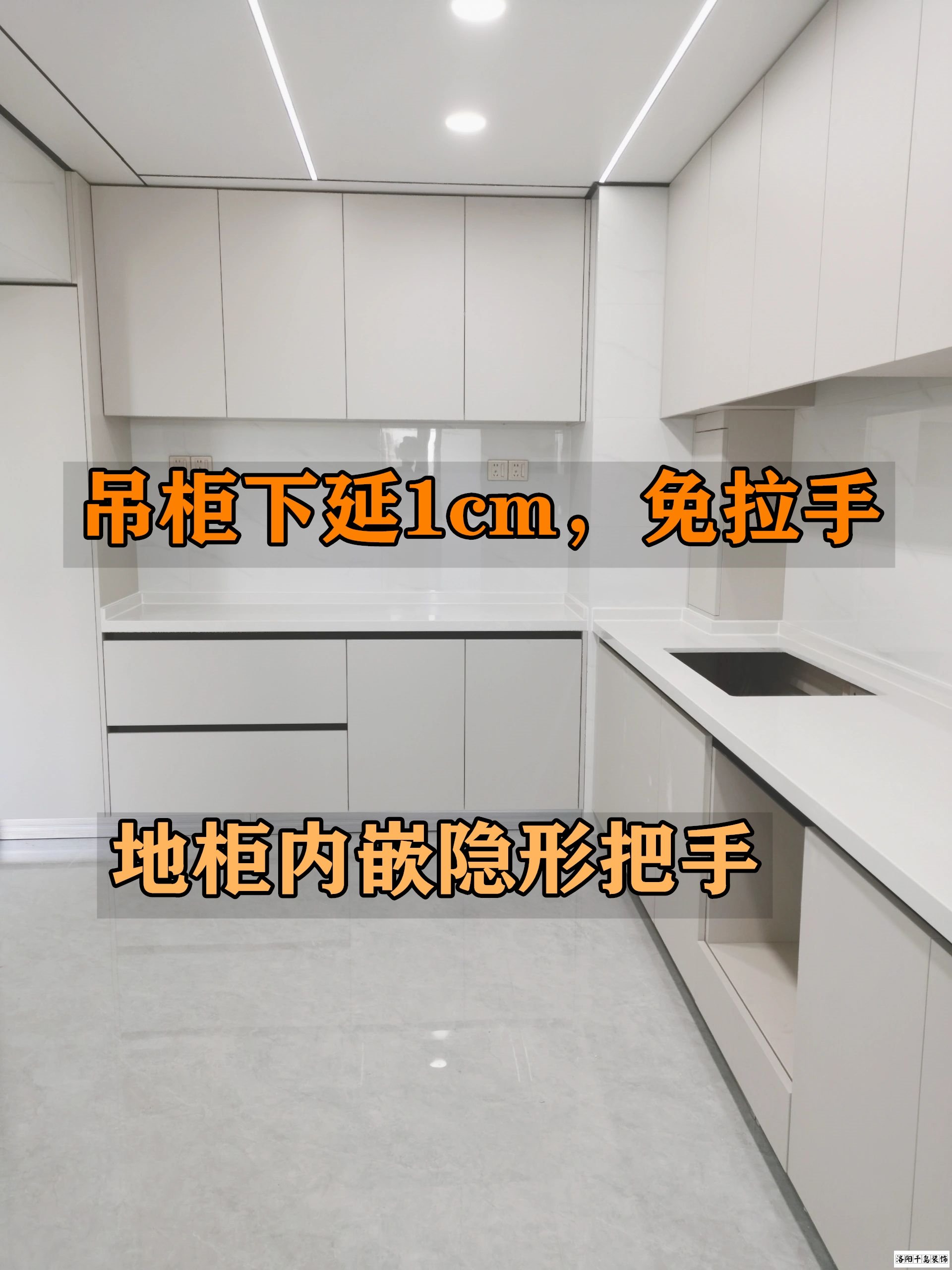 其次,櫥柜把手一個都不要做,容易磕碰不說,時間久了到處都是油,擦都擦不住,地柜柜我們就內嵌這種隱形把手,吊柜我們就這樣多做一厘米,手輕輕一摳就開了,而且呢,也不多花一分錢,整體看上去啊,更高級了。