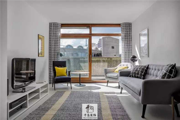 客廳的家具、布藝材質(zhì)都是灰白系的淡雅色調(diào),布藝上的格子印花增添紋理感,點綴色彩的巧妙做法是靛藍(lán)色與淺灰色單人沙發(fā)上,各放了一個檸檬黃的枕頭,使這片淺色調(diào)區(qū)域有了視覺焦點。