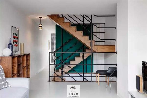 采光條件較差的樓梯空間,墻面被刷上了青綠色,進(jìn)一步凸顯出棕木色樓梯的原木質(zhì)感,并在黑色扶手與白色墻面之間起到了過渡作用。美美的墻邊柜空間也少不了小清新色彩裝飾畫的點綴。