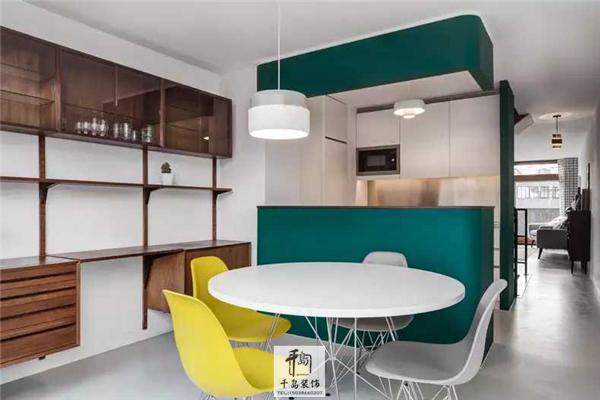 可以看到整個空間的鮮亮色彩不會超過三種,在統(tǒng)一中尋求獨立個性,黃白混搭的餐椅,部分刷上青綠色漆的櫥柜吧臺,在與留白之間的色彩切換,充滿節(jié)奏感。