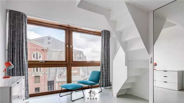 在二樓的落地窗旁,如此充滿陽光與詩意的角落,當(dāng)然得放上舒適的躺椅,愜意得享受窗外景色和陽光啦!柜子上的臺燈和躺椅更是組成了紅藍(lán)色彩CP~
