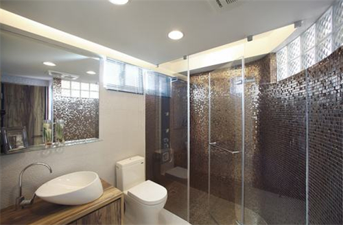 浴室用馬賽克裝飾一整塊墻壁,可能是一種比較奢華的感受。當然,馬賽克只是一種裝飾的技巧,我們可以在電視機的背景墻中增添一橫條,類似于銀鏡的裝修,能起到很好的裝飾效果。